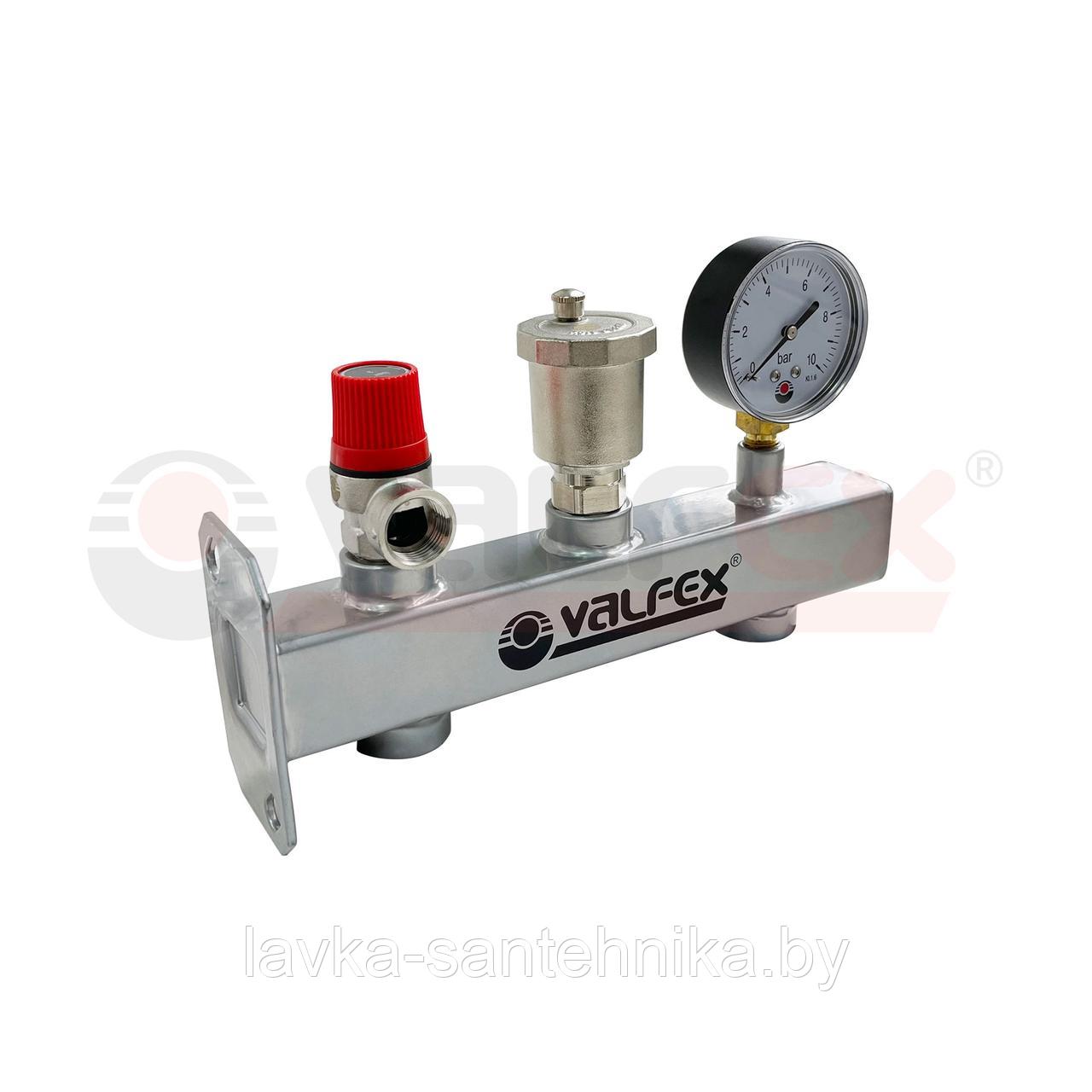 Группа безопасности комплектуется автоматическим поплавковым воздухоотводчиком, отсечным клапаном для воздухоотводчика, предохранительным клапаном и манометром-индикатором, что обеспечивает выполнение таких функций, как защита от превышения давления в системе, отвод воздуха и газов из системы и индикация давления на уровне манометра. Имеет дополнительный резьбовой выход для присоединения расширительного бака и фланец для крепления консоли к стене.